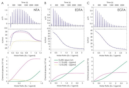 ITC of Eu3+ binding to NTA (A), EDTA (B), and EGTA (C). Top row: Thermograms obtained from titration of Eu3+ to the corresponding ligand. Middle row: Integrated heat and best fit. Bottom row: Speciation distribution of the measurement. For each ligand, the pictures represent one independent experiment.