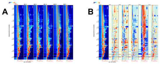 HS-GC-IMS was used to analyze the VOCs in six Rhizoma gastrodiae samples. A two-dimensional top view of the VOCs in the six Rhizoma gastrodiae samples was plotted using the Reporter plug-in (Figure 1), enabling a detailed comparison of the differences in VOCs between the different Rhizoma gastrodiae samples. The vertical coordinates indicate the retention time of the GC, and the horizontal coordinates indicate the drift time and the reactive ion peak (RIP). The different colored dots to the right of the RIP represent the different VOCs detected. The difference in color reflects the signal intensity of the different volatiles detected in each Rhizoma gastrodiae sample, with the red signal indicating a higher concentration of the detected volatiles and, the darker the color, the greater the intensity, indicating a greater concentration of that volatile substance and vice versa. As can be seen in Figure 1A, most of the signal occurs at retention times of 80–970 s and drift times of 1.0–1.9 ms.
