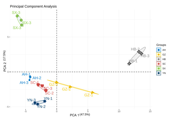 Results of the PCA analysis of Rhizoma gastrodiae samples from different origins.