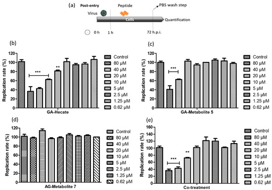 ZIKV strain PE243 replication percentage. (a) Schematic representation of the post-entry experiments. All dashed lines on the picture represent the PBS wash step. (b) GA-Hecate, (c) GA-metabolite 5, (d) GA-metabolite 7 and (e) co-treatment (GA-Hecate + GA-metabolite 5) after 72 hpi. Bars represent the standard deviation from triplicate samples of three independent assays. The ANOVA means control vs. concentration where *** p < 0.001; ** p < 0.01. Water was used as the negative control.