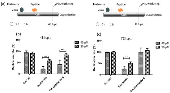 Effect of GA-Hecate and GA-metabolite 5 on ZIKV strain MP1751 replication. (a) Schematic representations of the post-entry experiments at 48 and 72 hpi, respectively. All dashed lines on the picture represent PBS wash steps. (b) A total of 48 hpi and (c) 72 hpi of treatment with 40 and 20 µM of GA-Hecate and GA-metabolite 5. Bars represent triplicate samples of three independent assays. *** p < 0.001; ** p < 0.01. Water was used as the negative control.
