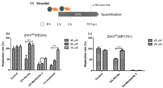 Virucidal effects on ZIKV strain PE243 and ZIKV strain MP1751 of GA-Hecate and GA-metabolite 5. (a) Schematic representation of the virucidal experiments. All dashed lines on the picture represent the PBS wash step. Replication rate at 72 hpi of treatment with 40, 20 and 10 µM of GA-Hecate and GA-metabolite 5 is shown in (b) for ZIKV strain PE243 and in (c) with 40 and 20 µM for ZIKV strain MP1751. Bars represent triplicate samples of three independent assays. *** p < 0.001. * p < 0.05. Water was used as the negative control. Co-treatment for ZIKV strain MP1751 was not shown once GA-metabolite 5 was almost completely inhibiting virus multiplication; the combination here is not appropriate.