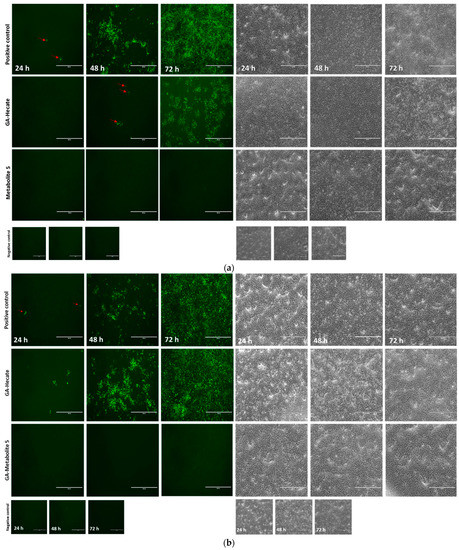 Fluorescence microscopy at 24, 48, and 72 h (hpi) of Vero cells infected with MP1571 after virucidal treatment. Vero cells were infected at an MOI of 0.1 with ZIKV strain MP1751, which had been pre-treated with (a) 40 µM or (b) 20 µM of GA-Hecate of GA-metabolite 5 for 1 h at 37 °C. Cells were washed with PBS and then incubated at 37oC for an additional 24, 48, and 72 h. The cells were then probed with anti-ZIKV E MAb 4G2, followed by anti-mouse IgG-Alexa Fluor-488, and subjected to fluorescent microscope analysis. Bars represent a scale of 400 µm. Arrows in red indicate the fluorescent focus. Water, the GA-peptide vehicle, was used as a negative control.