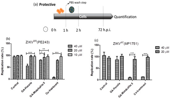 Protective effects on ZIKV strain PE243 and ZIKV strain MP1751 of GA-Hecate and GA-metabolite 5. (a) Schematic representation of the protective experiments. All dashed lines on the picture represent the PBS wash step. Replication rate at 72 hpi of treatment with 40, 20 and 10 µM of GA-Hecate and GA-metabolite 5 are shown in (b) for ZIKV strain PE243 and in (c) with 40 and 20 µM for ZIKV strain MP1751. Bars represent triplicate samples of three independent assays. *** p < 0.001; ** p < 0.01; * p < 0.05. Water was used as the negative control.