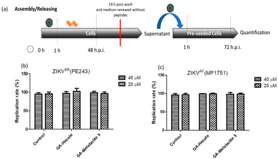 The activity of GA-peptides in different replication steps of the ZIKV strain PE243 (Asian lineage isolated in Recife, Brazil, during the outbreak in 2015—ZIKVBR)51 and the ZIKV strain MP1751 (African lineage isolated in Uganda in 1962—ZIKVAF)50 was evaluated [47,48].