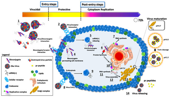 Flavivirus enter host cells through receptor-mediated endocytosis [28,29,30]. Once the virus is in the endosome, the acidic environment triggers the irreversible trimerization of the E protein, resulting in the fusion of viral and endosome membranes [32]. The RNA genome is then released into the cytoplasm, where it is translated into a polyprotein which is then processed by the host and viral proteases into mature proteins that participate in viral RNA synthesis, particle assembly, maturation, and release [32]. Currently, there are no approved vaccines or drugs to prevent or treat ZIKV infection, and as such, their development is of topical interest.