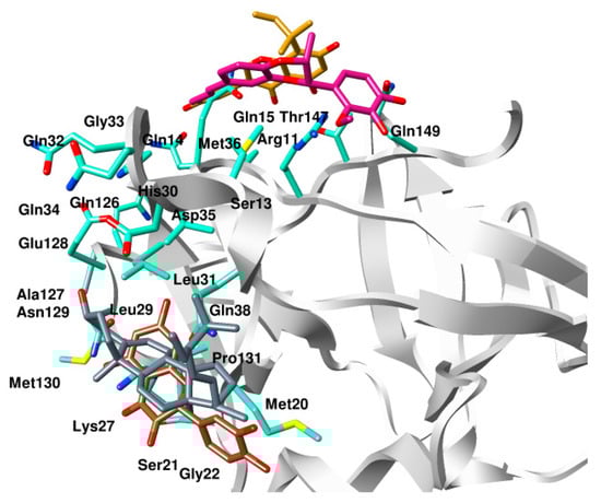 Using the interfacial residues of site A as a docking grid, molecular docking was carried out for all the compounds (~36,000) prepared from the TCM database. The docking simulation results were then analyzed based on the capability of the docked compounds to inhibit the protein–protein interaction of IL-1β/IL-1RI in the best-ranking binding pose. In the first step of the screening, the docked compounds were subjected to the protein-ligand interaction fingerprint (PLIF) module of MOE to fingerprint the interactions with the crucial residues. PLIF is a method for summarizing the interactions between ligands and proteins using a fingerprint scheme. Hydrogen bonds, ionic interactions, and surface contacts are classified according to the residue of origin, and built into a fingerprint scheme that is representative of a given database of protein–ligand complexes. Upon generating fingerprints for the ligands in the TCM database, it was observed that the compounds interacted with several key residues, including Met20, Ser21, Gly23, Tyr24, Glu25, Lys27, His30, Gln32, Gln34, Asp35, Gln38, Leu67, Glu128, Asn129, Thr147, and Gln149. In the first step, ~5000 compounds were shortlisted for further analysis. In the second step of the screening, the compounds were shortlisted on the basis of binding score. Notably, the highest binding score obtained was −14.9 kcal/mol. Consequently, the compounds with a binding score within the limits of −14.9 to −6.0 kcal/mol were preferred, leading to ~700 simulated hits. It is worth mentioning to the readers that the cutoff for the binding score was chosen by referring to a previous study, which reported the docking scores of biologically active IL-1β inhibitors to be below −6.0 kcal/mol [32]. In the last step of the screening, the compounds were visually analyzed. This analysis involved examining the hydrogen bonding and hydrophobic interactions with the essential residues as well as assessing the complementarity between the ligand and the binding site of IL-1β. After careful inspection, the four compounds were found to be the most potential binders of IL-1β and designated as compound 1, compound 2, compound 3, and compound 4. The chemical structures of the selected compounds are depicted in Table 1.