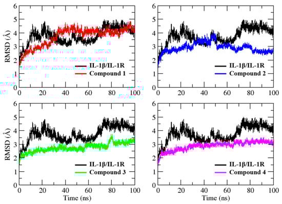 The MD simulation of the IL-1β/IL-1R complex revealed a dramatic change from the initial structure, with ~5 Å of difference in RMSD (Figure 4). Interestingly, despite the small size of the selected hit compounds relative to the IL-1R, the binding of the ligand to the IL-1β binding site resulted in a more stable protein conformation and exhibited less variation throughout the simulation, with the exception of compound 1, which could be attributed to its relatively lower docking score compared to that of the other compounds. For compound 1, the RMSD showed a gradual increase of up to 4.5 Å during the first 40 ns of simulation, followed by another increase in the RMSD value during the final 10 ns. Similarly, for compound 2, the RMSD increased gradually up to 4.0 Å during the first 50 ns of simulation. After the initial 50 ns, the system gradually achieved stability and remained stable until the end of the simulation, with minor fluctuations. For compound 3, the system experienced fluctuations between 2 Å and 3 Å during the simulation, with a consistently stable RMSD except for frames between 75 and 85 ns, where some sharp fluctuation peaks were observed but still remained within an acceptable range. On the other hand, the complex of compound 4 showed the most stable RMSD below 3.5 Å with minimal variation, indicating that the system had converged well.