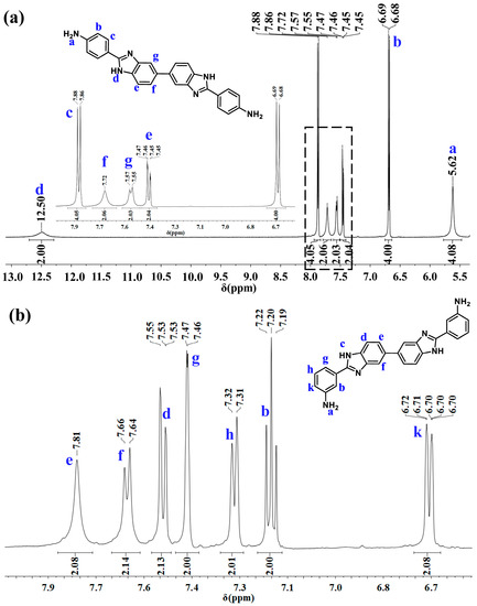4-AB and 3-AB containing bis-benzimidazole moieties were designed and prepared from 3-aminobenzoic acid or 4-aminobenzoic via one-step dehydration condensation. The chemical structure of the synthesized monomer was characterized via 1H NMR, 13C NMR, and TOF-MS spectroscopy. The 1H NMR spectrum of 4-AB and 3-AB is given in Figure 2, while 13C NMR and TOF-MS spectroscopy are shown in Figures S1 and S2, respectively. The signals of aromatic protons in the phenyl structure appeared in the region of 8.00–6.50 ppm. Due to the intermolecular hydrogen bonds formed between -NH2 and N-H groups, the single broad peak resonating at 5.71 ppm was assigned to the protons in the amino groups, while the proton of N-H in benzimidazole was observed at 12.56 ppm. Moreover, the protons of amino and N-H groups in 3-AB were not observed because the broad bands of the hydrogen bond and N-H with lower intensity were overlapped with the peaks of the aromatic protons. Finally, 13C NMR and TOF-MS confirmed that 4-AB and 3-AB were successfully synthesized.