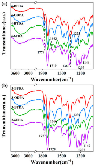 The anticipated chemical structures of the corresponding homo-PIs were confirmed via ATR-FTIR, as illustrated in Figure 3. All PIs exhibited a similar waveform, and the characteristic absorption of the PIs originated from the imide ring. The presence of peaks corresponding to C=O stretching bonds (~1779 cm−1 and ~1719 cm−1) and a C-N axial stretching bond (~1360 cm−1) in imide moieties indicated the formation of imide rings. With the exception of PIs prepared from dianhydride BTDA (i.e., 4-BTDA and 3-BTDA), there were no peaks observed around 1660 cm−1 and 1550 cm−1 for intermediate poly(amic acid), indicating that there was a nearly complete conversion of the poly(amic acid) precursor into PIs [25]. The obtained 4-BTDA and 3-BTDA also showed complete imidization, as evidenced by the presence of peaks at around 1663 cm−1 assigned to C=O in BTDA [26,27], while the peak at 1550 cm−1 for poly(amic acid) was hardly observed. The PIs of 4-ODPA and 3-ODPA showed typical Carom-O-Carom vibration absorption signals at around 1233 cm−1 [28,29]. Additionally, for 4-6FDA and 3-6FDA, peaks at around 1207 cm−1 and 1144 cm−1 for-CF3 and C-F [30,31] vibration were also observed. All of these results suggest that the PIs were successfully prepared.