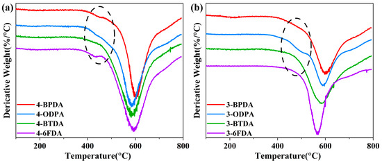 DTG curves of PI films containing (a) 4-AB and (b) 3-AB (The dashed elliptical area was the temperature between 400 and 500 °C which exhibited a slight weight-loss slope).