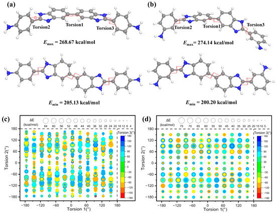 where HR is the molar rotational energy, R is a constant, and n is the degree of freedom of the expressions of kinetic energy. Simulated calculations were performed to investigate the rotational energies of 4-AB and 3-AB. Considering that the rigid aromatic ring and heteroaromatic ring were difficult to rotate but vibrated, there were only three rotatable torsions occurring at the linking bond between benzene and benzimidazole rings, as shown in Figure 9a,b. The lowest rotational energy structure was designated as the reference point, set to zero, and the changes in rotational energy were recorded. The changes in rotational energy when the three torsions were rotated simultaneously are depicted in Figure 9c,d to illustrate the additional energy needed for rotation. The larger the diameter of the round bubble, the higher the rotational energy required. The maximum change in rotational energy for 3-AB was 73.94 kcal/mol, which was higher compared to 4-AB (63.54 kcal/mol). Additionally, the rotational energy changes in the three torsions rotating independently also demonstrated that the energy required for rotation in 3-AB was higher than in 4-AB, as shown in Figure S5. As a result, when polymerized with the same dianhydride, the PIs containing twisted 3-AB required more energy for rotation, resulting in higher Tg values for the corresponding films.