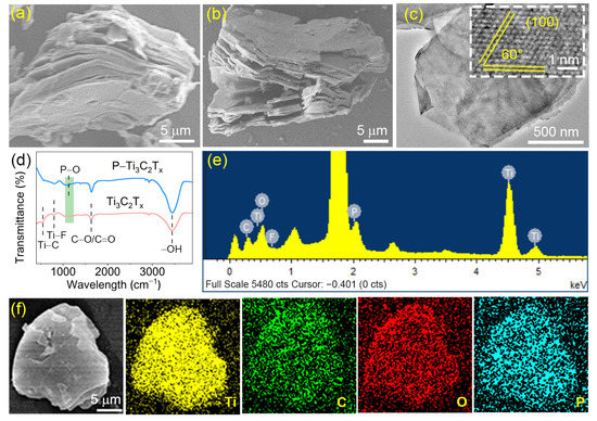 The morphologies and microstructures of the prepared samples were analyzed by using scanning electron microscopy (SEM) and transmission electron microscopy (TEM). Ti3C2Tx and P–Ti3C2Tx display the same structure with an accordion shape (Figure 1a,b), proving that the surface morphology of Ti3C2Tx is not affected after annealing treatment with NaH2PO2·H2O. The smooth and thin P–Ti3C2Tx nanosheets are observed in the TEM image (Figure 1c), further indicating the maintenance of a lamellar structure. Moreover, a high-resolution transmittance electron microscopy (HRTEM) image of P–Ti3C2Tx (Figure 1c insert) shows a hexagonal structure demonstrated by different grain orientations with 60° angles and lattice fringes of 0.26 nm which is attributed to the (100) lattice planes of the Ti3C2Tx. Fourier transform infrared (FTIR) spectra were used to investigate the change in the surface chemical state of Ti3C2Tx upon P doping (Figure 1d), which indicates the presence of several common peaks belonging to Ti3C2Tx MXene, such as Ti–C (~555 cm−1), Ti–F (~800 cm−1), C–O/C=O (~1640 cm−1) and –OH (~3440 cm−1) in the range of 400–4000 cm−1 [32,33,34]. Notably, the new peak in P–Ti3C2Tx appearing near 1120 cm−1 corresponds to the P–O bond, which suggests that P atoms are successfully doped in Ti3C2Tx [26]. In addition, the energy dispersive spectroscopy (EDS) spectrum and element mapping images display the presence and uniform distribution of Ti, C, O, and P elements in P–Ti3C2Tx (Figure 1e,f), testifying that P atoms are successfully doped, which match well with the result of FTIR analysis.