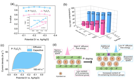 The charge storage mechanism of P–Ti3C2Tx and Ti3C2Tx. (a) The b values of P–Ti3C2Tx and Ti3C2Tx; (b) Comparison plot between Ti3C2Tx (pink) and P–Ti3C2Tx (blue) of the normalized contribution of capacitive at various scan rates; (c) CV data of P–Ti3C2Tx corresponding to the capacitive contribution for the total current at 100 mV s−1; (d) Schematic illustration of charge storage of hydrated electrolyte ions in Ti3C2Tx and P–Ti3C2Tx.