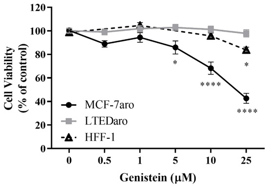 2.1. Genistein Decreases Cell Viability of ER+ Breast Cancer Cells