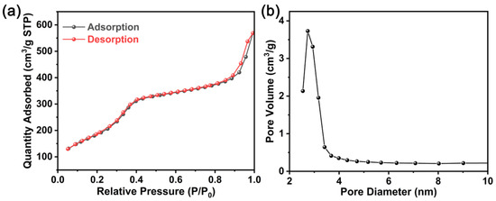 The as-prepared SiO2 was characterized to ascertain its features. Firstly, the nitrogen adsorption–desorption isotherm of SiO2 was measured and shown in Figure 1a. As can be seen, the SiO2 presents a type IV isotherm, reflecting the characteristics of typical mesoporous materials. A BET-specific surface area of 912.03 m2 g−1 is received. From the pore diameter distribution curve (Figure 1b), the Barrett–Joiner–Halenda cumulative pore volume and average pore diameter are about 0.57 cm3 g−1 and 3.56 nm, respectively.
