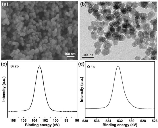 The X-ray photoelectron spectroscopy (XPS) data were collected to explore the elemental composition and chemical state of the as-prepared SiO2. From Figure 2c,d, two strong peaks attributed to Si and O are observed, which demonstrates the existence of Si and O elements in the as-prepared SiO2. In general, the spectrum reported by Si 2p consists of two contribution signals, which include the Si 2p3/2 and Si 2p1/2 spin orbit coupling states. However, the energy interval between the two peaks is only approximately 0.5 eV, allowing the spectrum to exhibit with a single peak [47]. As shown in Figure 2c, the Si 2p spectrum of the as-prepared SiO2 is detected by one peak at a binding energy of 103.0 eV, which demonstrates for the Si4+ species in SiO2 [48]. For the O 1 s photoelectron spectrum (Figure 2d), a strong peak located at a binding energy of 532.3 eV is detected in the as-prepared SiO2, and the signal denotes lattice oxygen.