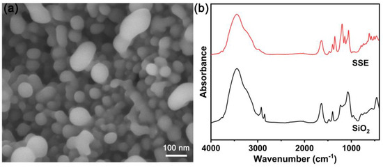 (a) SEM image of the hybrid SSE, and (b) FT-IR curves of SiO2 scaffold and hybrid SSE.