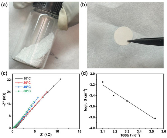 Photographs of (a) dry-state hybrid SSE powder and (b) hybrid SSE slice; (c) EIS plots of SS|SSE|SS symmetrical cell at different temperatures; and (d) the temperature dependence of ionic conductivity of the hybrid SSE. Before EIS testing, the battery is kept warm for half an hour at each temperature.