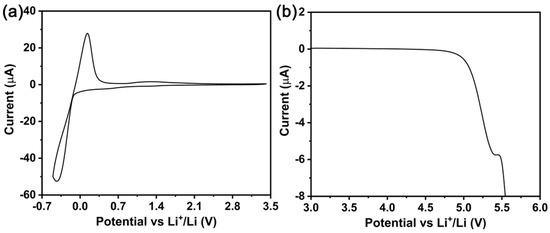Obtaining an electrochemical window for the hybrid SSE is a crucial prerequisite for verifying the compatibility of the anode and cathode materials in solid-state batteries. A Li|SSE|SS asymmetrical cell was assembled and then measured by cyclic voltammetry (CV) and linear sweep voltammetry (LSV) to inspect the electrochemical potential window. As displayed in Figure 7a, the cathodic limiting potential is around 0 V. There are two obvious redox peaks in the CV curve, which agree with the previous reports [46,51]. The significant oxidation peak between 0 V and 0.5 V vs. Li+/Li corresponds to the stripping of the lithium ion from the SS electrode while another reduction peak indicates the plating of the lithium ion onto the SS electrode. Figure 7b shows the LSV curve of the Li|SSE|SS asymmetrical cell. As can be seen, the hybrid SSE has favorable electrochemical stability. The obvious oxidation reaction occurs only when the anodic potential exceeds 5.0 V vs. Li+/Li, which may be due to the chemical decomposition of the functional group in the ionic liquid, leading to the generation of a current. From this, the electrochemical potential window is approximately 5.0 V. These results imply that the hybrid SSE does not undergo reactions with the lithium metal electrode, and can be expected to be applied in a LVP-cathode-based high-voltage lithium metal battery.