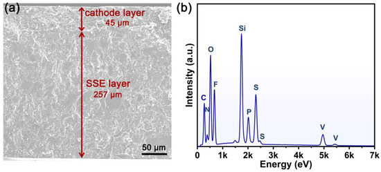 (a) The cross-sectional SEM image and (b) EDS plot of cathode and hybrid SSE bilayer structure.