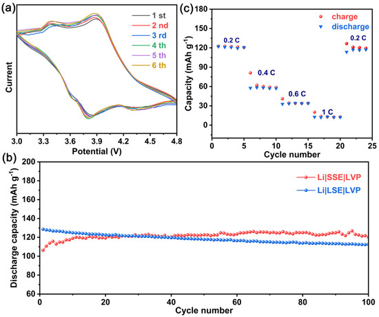 A Li|SSE|LVP battery was then assembled using the aforementioned bilayer structure as the electrolyte and cathode to investigate electrochemical performance. Firstly, the reversibility of the Li|SSE|LVP battery was tested by CV. As illustrated in Figure 10a, the CV curves of the Li|SSE|LVP battery are basically stable during the cycle, confirming that the employment of the hybrid SSE is beneficial to increasing the reversibility of the lithium metal battery. Moreover, the successive galvanostatic charge/discharge measurements of the battery were performed at a 0.2 C rate and room temperature. As illustrated in Figure 10b, the initial cycling of the Li|SSE|LVP battery exhibits a discharge capacity of about 106 mA h g−1. After 10 cycles, the discharge capacity increases to about 120 mA h g−1 and then remains stable. The discharge capacity is well-maintained after 100 cycles. The Li|SSE|LVP battery possesses excellent cycling performance, which verifies the hybrid SSE can effectively work with a high-voltage cathode material and shows satisfying stability.