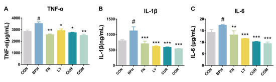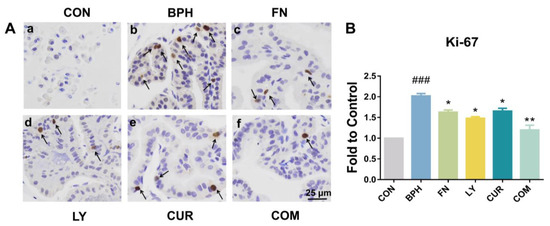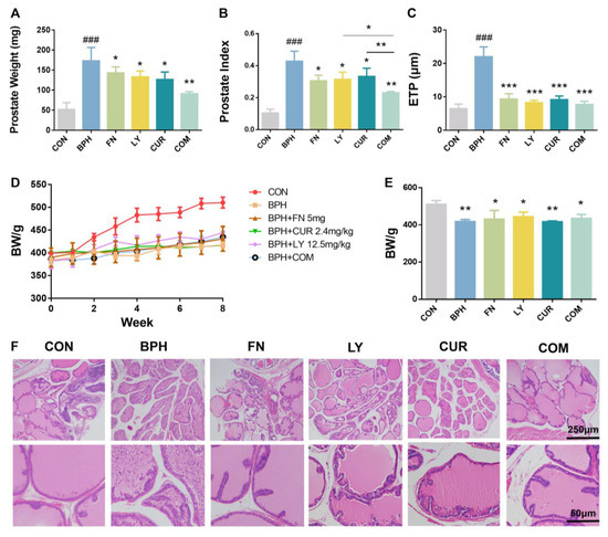 2.2. Effects of LY and CUR Combination Treatments on BPH Development in Rats