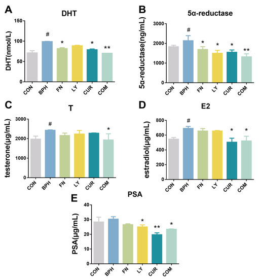- Wang, C.; Luo, F.; Zhou, Y.; Du, X.; Shi, J.; Zhao, X.; Xu, Y.; Zhu, Y.; Hong, W.; Zhang, J. The therapeutic effects of docosahexaenoic acid on oestrogen/androgen-induced benign prostatic hyperplasia in rats. Exp. Cell Res. 2016, 345, 125–133. [Google Scholar] [CrossRef]