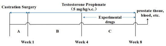 - Abdel-Aziz, A.M.; El-Tahawy, N.F.G.; Abdel haleem, M.A.S.; Mohammed, M.M.; Ali, A.I.; Ibrahim, Y.F. Amelioration of testosterone-induced benign prostatic hyperplasia using febuxostat in rats: The role of VEGF/TGFβ and iNOS/COX-2. Eur. J. Pharmacol. 2020, 889, 173631. [Google Scholar] [CrossRef]
