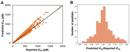 In addition, for the 343 peptides included in the test set, the ratio of the predicted IC50 and the reported IC50 was plotted. As shown in Figure 3, the ratio of 256 peptides were distributed within the range of 0.75 and 1.25, which suggested the accuracy of the model.
