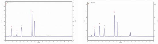 Organic compounds were identified by compiling retention times and UV adsorption spectra obtained during the chromatographic analysis of the solutions of standard substances and the solutions of test substances. The data obtained from the chemical analysis were subjected to a one-way analysis of variance, followed by a post hoc Tukey test, using the STATISTICA v.13 software (Statsoft, Tulsa, OK, USA). All experiments were carried out in triplicate, and data were presented as mean ± standard deviation (SD). Furthermore, differences between groups were considered statistically significant when p-values were 0.05 or less.