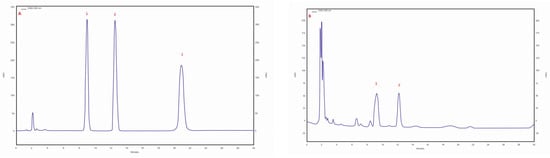 (A) sample chromatogram of the standards of selected triterpenes: 1. betulin, 2. betulinic acid, 3. inotodiol; (B) sample chromatogram of the extract from Inonotus obliquus mycelial cultures (isolate 30 am): 1. betulin, 2. betulinic acid.