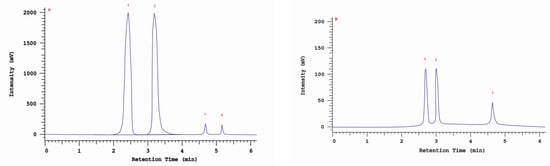 The presence of caffeic and p-coumaric acid was observed in isolates/strains extracted from pseudosclerotium collected from B. pendula grown on an MEA medium with a 5% addition of birch wood (29 ambz, 30 ambz) and without this addition (29 am, 30ambz), and in isolates of 43 am ranging from 43.6 mg/100 g DM in 29 ambz (p-coumaric acid) to 3.2 mg/100 g DM in 43 am (caffeic acid). The chromatogram of the standards of the selected phenolic acids and the sample chromatogram of the extract from I. obliquus mycelium are shown in Figure 1.
