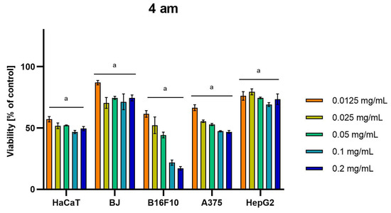 Results of cytotoxicity evaluation of 4 am (detailed characteristics of the strain are described in Table 4) in the concentration range of 0.0125–0.2 mg/mL. The viability was determined using an MTT assay. Each experiment was conducted in triplicate. Graphs represent the number of viable cells expressed as the percent of control ± SD. Results indicated with “a” were considered statistically significant (p < 0.05).