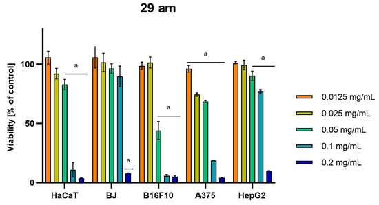 Results of cytotoxicity evaluation of 29 am (detailed characteristics of the strain are described in Table 4) in the concentration range of 0.0125–0.2 mg/mL. The viability was determined using an MTT assay. Each experiment was conducted in triplicate. Graphs represent the number of viable cells expressed as the percent of control ± SD. Results indicated with “a” were considered statistically significant (p < 0.05).