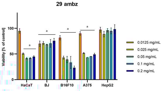 Results of cytotoxicity evaluation of 29 ambz (detailed characteristics of the strain are described in Table 4) in the concentration range of 0.0125–0.2 mg/mL. The viability was determined using an MTT assay. Each experiment was conducted in triplicate. Graphs represent the number of viable cells expressed as the percent of control ± SD.) Results indicated with “a” were considered statistically significant (p < 0.05).