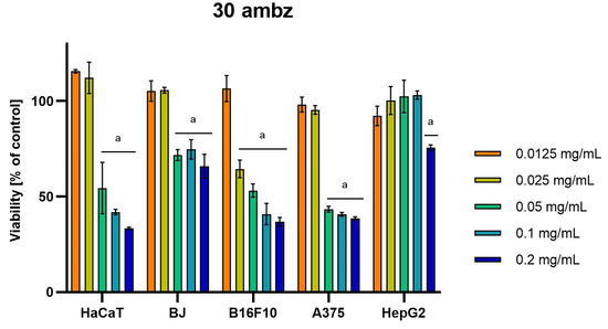 Results of cytotoxicity evaluation of 30 ambz (detailed characteristics of the strain are described in Table 4) in the concentration range of 0.0125–0.2 mg/mL. The viability was determined using an MTT assay. Each experiment was conducted in triplicate. Graphs represent the number of viable cells expressed as the percent of control ± SD. Results indicated with “a” were considered statistically significant (p < 0.05).