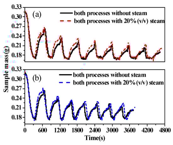 The effect of steam atmosphere on the Ca-looping calcination/carbonate process in laboratory tests still faces some challenges. A fluidized bed reactor is very good at simulating actual working conditions of Ca-looping cycles, but it is difficult to obtain reaction kinetics data and to evaluate the influences that individual operation parameters have. TGA is commonly used to measure calcination/carbonation kinetics [27,28,29]. Therefore, more researchers have used TGA to conduct Ca-looping experiments. However, the heating rate of TGA is usually set as 10–20 K/min, and diffusion resistance is serious, which is inconsistent with the factor that the Ca sorbent is cycling between the high-temperature calcination reactor (about 900 °C) and low-temperature carbonation reactor (about 650 °C) [30].