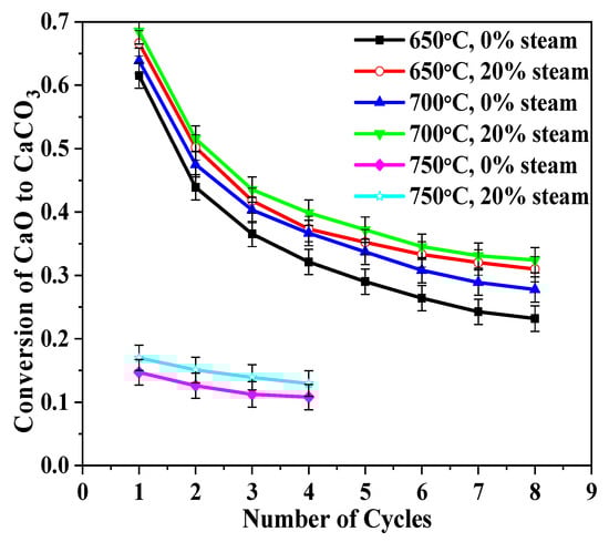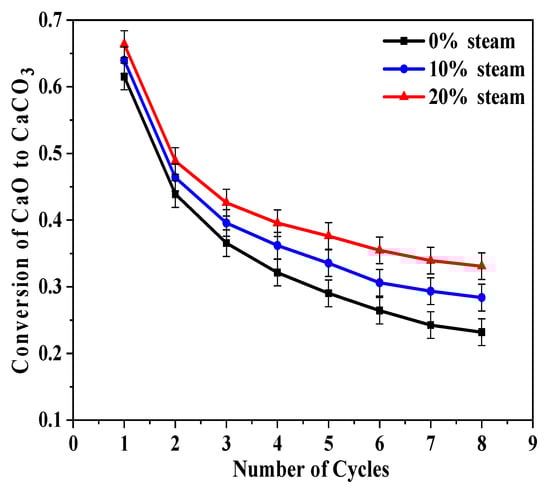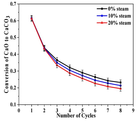 There was little difference in carbonation conversion for the CaO that calcined with steam until the third cycle. For the first carbonation cycle, the conversion was almost the same (~0.63) for all three of the calcination conditions. The differences became obvious at higher cycle numbers. For example, in the eighth cycle, the conversion ratio was 0.23 for CaO that was calcined without steam, 0.21 with 10% steam, and 0.19 with 20% steam. It can be concluded from the results shown in Figure 3 that the presence of steam in the calcination stage led to lower carbonation conversion of CaO, and when there is more steam, the sintering is more severe, which is consistent with previous studies [31] in showing that steam can accelerate the sintering of CaO and result in decreased surface area and porosity.