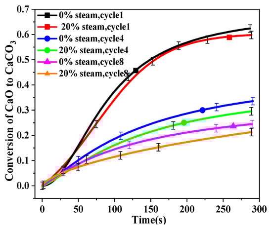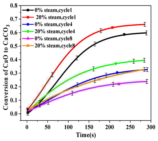 The first, fourth, and eighth carbonation cycles were recorded to help understand the effect of steam addition on carbonation reaction, and the results are shown in Figure 4. For the first cycle, there was almost no difference between CaO that was calcined with 0% and 20% steam. However, after four cycles, the differences became significant, especially after 50 s. Obviously, the addition of water vapor in the calcination shows a negative effect on the subsequent carbonation.
