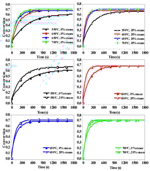 As also seen in Figure 9, steam improved the conversion of CaO to CaCO3 at all three carbonation temperatures. However, the magnitude of improvement was different, and the improvement was less pronounced at higher temperatures. A probable reason for this is that steam plays a catalytic role in the carbonation process. As a necessary process for a catalyst, steam must be adsorbed onto the surface of CaO. However, higher temperature had a negative effect on the adsorption process [18]. Hence, with an increase in the carbonation temperature, the catalytic effect of steam decreased.