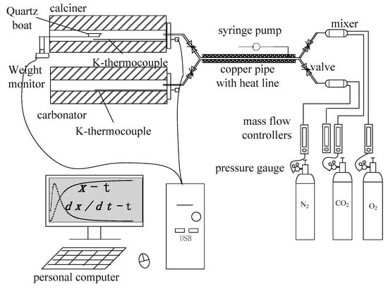 The limestone samples underwent calcination and carbonation in two separate tube furnaces, and the sample weight was measured continuously using a detection system. The experimental setup is shown in Figure 13.