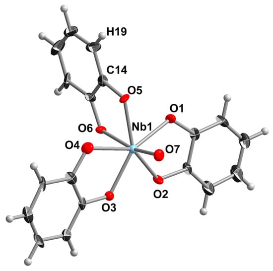 Catecholates belong to redox-active ligands, which can be reversibly oxidized in two consecutive steps and can act as electron reservoirs for activation for both substrates and metal centers. They can also be used to design novel magnetic and optic materials [30,31,32]. Regarding the catecholates, it was apparently Rosenheim who in 1932 reported the dissolution of niobic acid in alkaline catechol (C6H4(OH)2, H2cat) solutions [33]. Later, in 1959, Brown and Land studied this reaction with UV-VIS techniques [34,35]. This approach was used in the analytical chemistry of Nb and Ta [36]. Several salts of [NbO(cat)3]3− and [Ta2O(cat)6]4− were isolated but not structurally characterized [37].