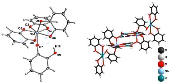 In this study, complexes with NbV coordination environments have not been reported. In this complex anion, Nb has CN 7 with a pentagonal-bipyramidal coordination polyhedral, but without any Nb=O bond. Instead, this position is occupied by a phenolic oxygen from a monodentately coordinated Hcat− anion. The Nb-O axial bond distances are 1.9623(9) Å (Hcat) and 2.0033(9) Å (cat). The equatorial Nb-O bond distances fall into a 2.0033(9)–2.1211(10) Å interval. Moreover, the anion structure is stabilized by the intramolecular H-bond, d(H18-O6) = 1.922(2) Å. This structure can be regarded as a kind of intermediate between [NbO(cat)3]3− and [Nb(cat)4]3−. It should be noted that only a single complex of Nb with 4 O-donor bidentate ligands, and this is of NbIV, has been structurally characterized [46]. In the crystal structure, K+, H2O, [Nb(cat)3(Hcat)]2−, and neutral H2cat molecules combine into linear neutral associates (Figure 2, right).