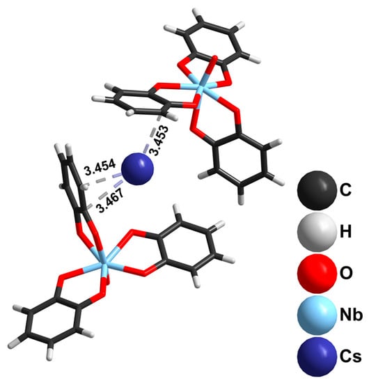 The use of Cs8[Nb6O19]·14H2O and 2M CsOH under the same reaction conditions leads to the crystallization of Cs3[NbO(cat)3]·H2O (3). The geometry of this Nb complex is practically the same as 1. The most interesting feature of this structure is the location of Cs+ cations. Curiously, crystallization from the aqueous solution does not supply water molecules to the cesium coordination sphere. Instead, Cs+ prefers Cs+-π interactions with the aromatic catechol rings of adjacent [NbO(cat)3]3− complexes (Figure 3). A search of the Cambridge Structural Database [47] yielded few other examples of such coordination, but in all cases, Cs+ was involved in both Cs-π and Cs-OH2 bonding [48,49].