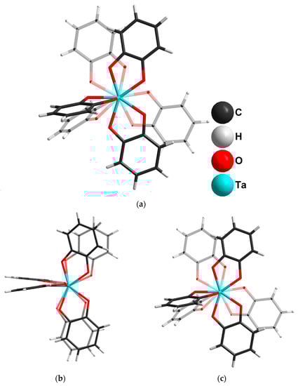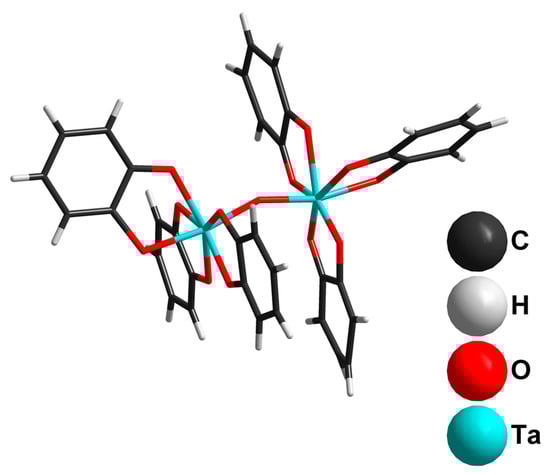The chemistry of Nb and Ta in oxidation state 5+ is typically associated with polyoxometalates (POM), which have been extensively studied in the last decade by the research groups of Nyman [1,2,3,4], Niu [5,6,7,8], and Sokolov [9,10,11,12,13]. Compared to POM chemistry, there are two relatively small branches of group 5 chemistry dealing with non-organometallic mononuclear M(V) complexes: (i) peroxocomplexes and (ii) [MOL3]n− coordination compounds with selected organic ligands. These complexes are of potential interest as catalysts for organic oxidation reactions [14,15,16,17,18]. The [MOL3]n− are mostly represented by oxalate complexes studied by Planinic, Juric et al. [19,20,21,22]. Recently, we have added novel photoactive salts into this family [23] and reported a binuclear oxalate complex [Nb2O2(C2O4)4(µ-C2O4)]4− [24]. Outside the oxalate field, Loiseau et al. reported interesting examples of polynuclear niobium(V)-based carboxylate oxo complexes obtained by controlled hydrolysis of [Nb(OEt)5] in the presence of different carboxylic acids [25,26]. Among the few non-carboxylate complexes, there are two structurally characterized complexes of M(V), which should be taken into consideration. The oxo-tris-(tropolonato)niobium(V) monohydrate was prepared by Drew et al. [27] by hydrolysis of tetrakis-(tropolonato)niobium(V) complex [28]. The tris(1,2-dimethyl-3-hydroxy-4(1H)-pyridone)oxotantalum(V) was reported by Mazzi et al. [29] as a new agent for 178Ta radiopharmaceutical applications.