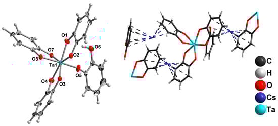 The structure of the [Ta(cat)3(Hcat)]2− complex (ellipsoid plot with 50% probability) in the crystal structure of 5 (left); location of Cs+ cation in the crystal structure of 5 (right).