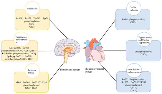 Changes in Cx43 phosphorylation in major diseases of the cardiovascular system and the nervous system and its influence on Cx43 HCs and Cx43 GJIC. Cx43, Connexin 43; HC, hemichannel; GJIC, gap junction intercellular communication; ↑, Increase; ↓, Decrease.