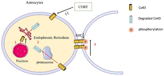 Schematic representation of Cx43 expression and phosphorylation of astrocytes in depression. (1) CORT reduced the synthesis of Cx43 and the distribution of Cx43 in the membrane in astrocytes. (2) Cx43 was degraded by a proteasome. (3) CORT reduced the distribution of Cx43 in the membrane and in the meantime increased the phosphorylation of Cx43 at Ser368 in the prefrontal cortical astrocytes and hippocampal astrocytes, thereby inhibiting the communication mediated by gap junctions.