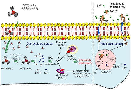 - Bouché, M.; Hognon, C.; Grandemange, S.; Monari, A.; Gros, P.C. Recent advances in iron-complexes as drug candidates for cancer therapy: Reactivity, mechanism of action and metabolites. Dalton Trans. 2020, 49, 11451–11466. [Google Scholar] [CrossRef]